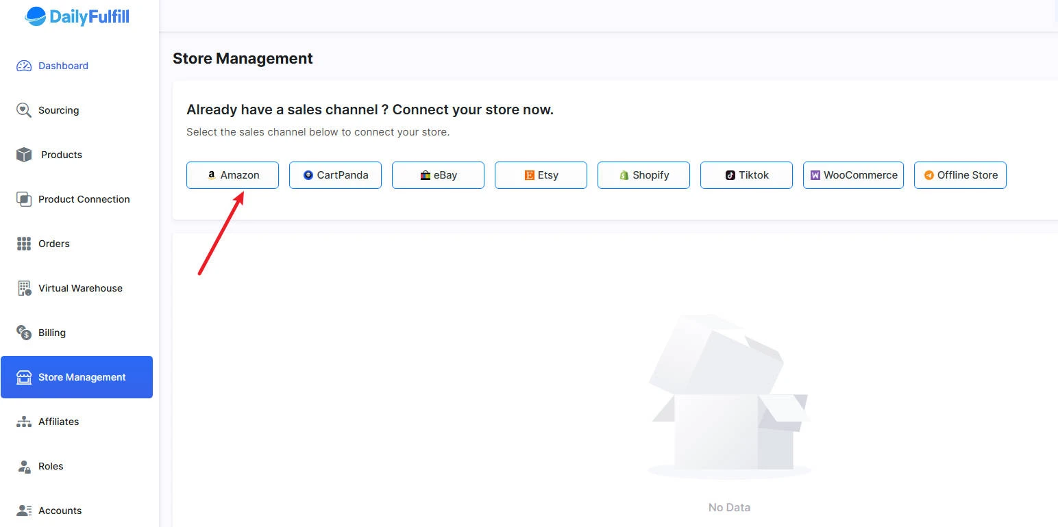 Inside our app, look at the menu and click on “Store management”. Then, pick Amazon from the list of platforms.