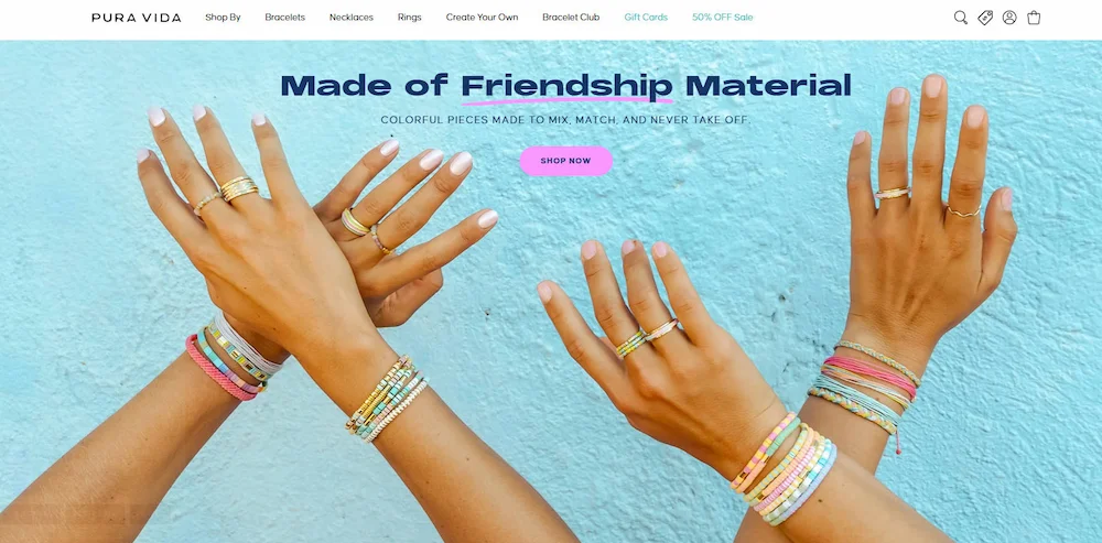 Pura Vida sells jewelry and accessories with a beach style. The brand is for people who love the beach and fun. You will see bright pictures and easy menus. Pura Vida’s story connects with shoppers, and the site shows real customer photos and influencer posts. The loyalty program gives rewards for coming back, and clear return rules help you trust the store.