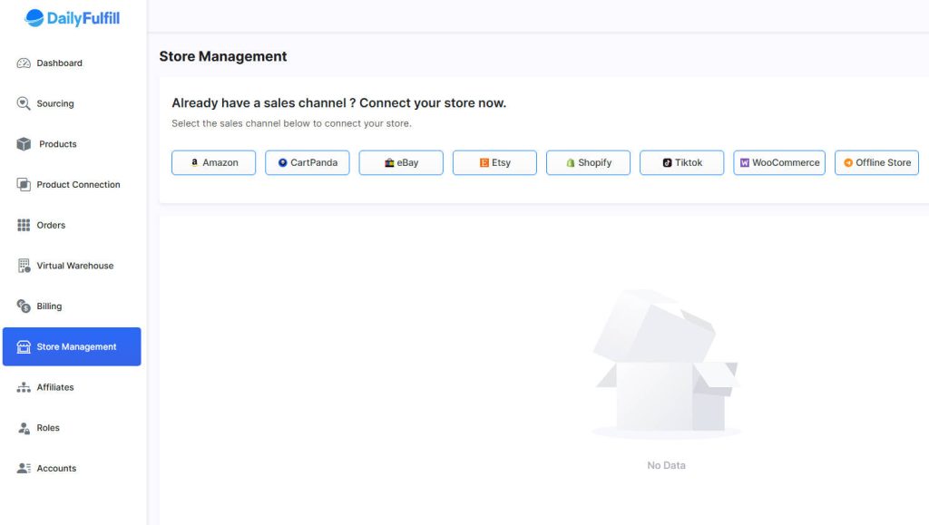 Inside the dashboard, click "Store Management" and choose your platform from the list. We support Amazon, eBay, Etsy, Shopify, TikTok Shop, and more.