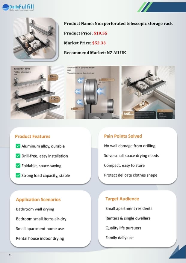 An aluminum alloy, drill-free foldable rack for bathrooms and bedrooms.