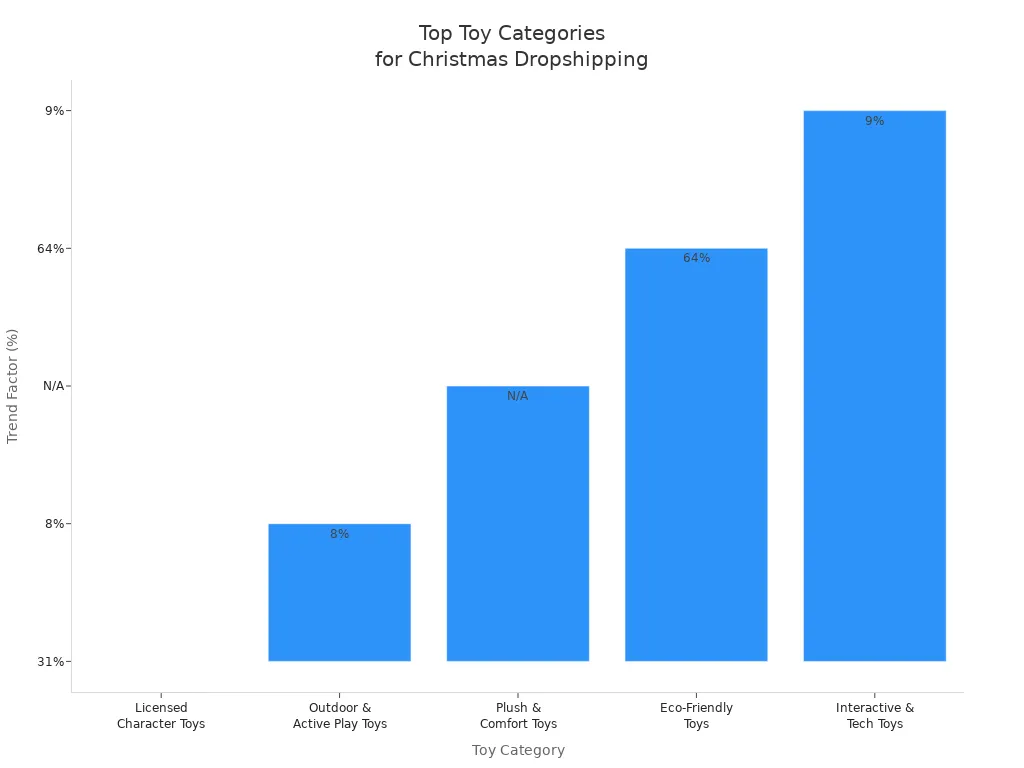 Toys are always wanted for christmas dropshipping. Kids get excited for new toys every year. Licensed character toys, outdoor toys, plush toys, eco-friendly toys, and tech toys are all popular. Plush toys like giant pillows are a hit on TikTok. Eco-friendly toys are liked by parents who care about the planet.