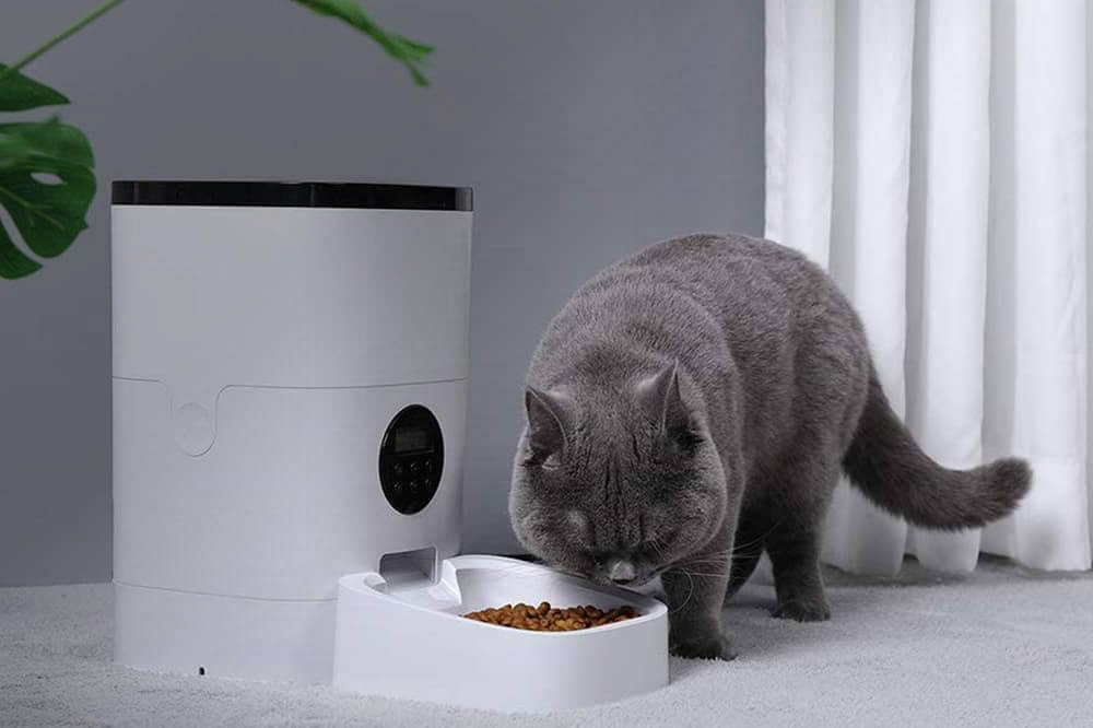 Smart feeders are machines that hold dry cat or dog food and drop it into a bowl at a specific time. You can control the feeder using an app on your phone.