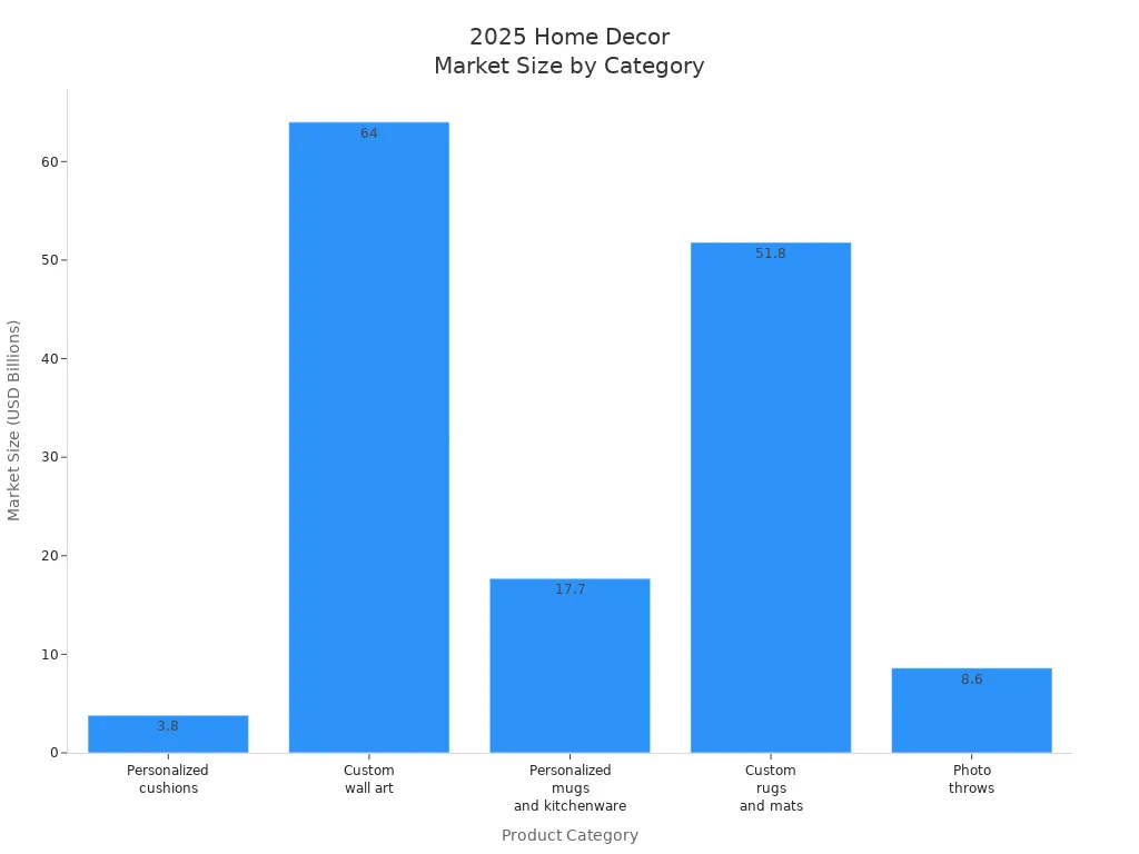 Home decor is a top seller in print-on-demand stores. You can make custom wall art, personalized cushions, photo throws, and kitchenware. The market for custom wall art is very big, with $64 billion in sales in 2024. Personalized cushions and rugs are also growing fast. You can design products for holidays, birthdays, or special days. Many print-on-demand companies let you add photos, names, or messages to each item. JBørn Baby Products is a print-on-demand store that sells custom nursery decor.